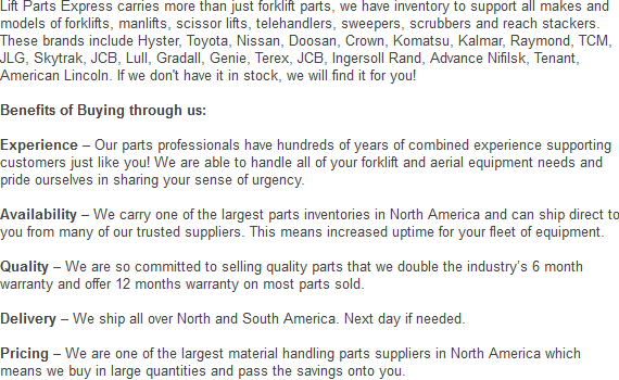 We have great prices on all our lift truck parts. Phone now to get a price quote on one of the parts or attachments we offer. We can be reached at: